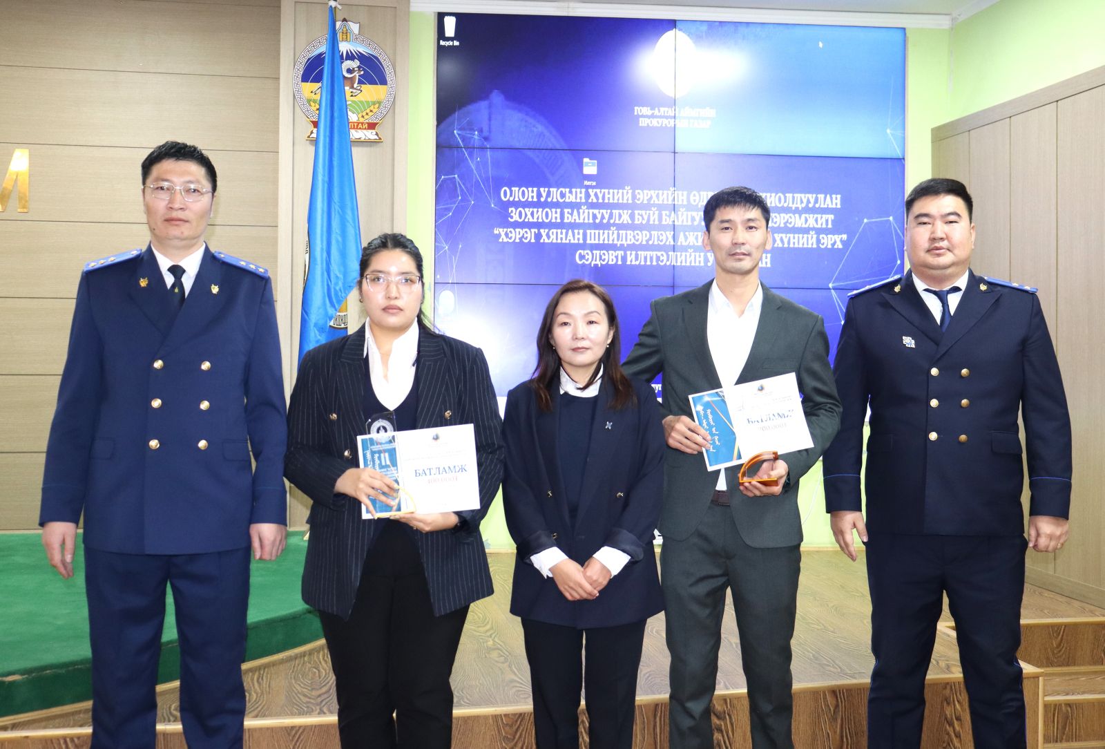Говь-Алтай аймгийн прокурорын газраас хүний эрхийг хамгаалах, зөрчигдсөн эрхийг сэргээх, хууль эрх зүйн мэдлэг, ажлын ур чадварыг нэмэгдүүлэх зорилгоор тус аймгийн хуулийн байгууллагуудын ажилтан, албан хаагчдын дунд “Хэрэг хянан шийдвэрлэх ажиллагаа ба хүний эрх” сэдэвт илтгэлийн уралдааныг зохион байгууллаа.